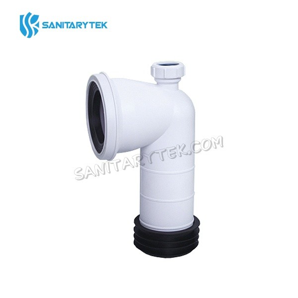 90° bend rigid polypropylene WC pan connector (with 1¼" boss adapter), can also be cut to suit and is for use with 4" (110mm) pipe.