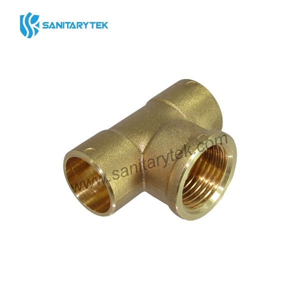 Tee with connection for soldering to copper pipe and female thread. It's a fitting made in brass, for copper tube, allowing a 90º change of direction. It has got one end male which allows a female thread connection and the other end is for copper pipe welding.