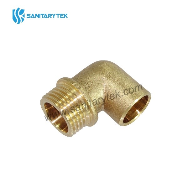 Brass male elbow to copper. It's a fitting made in brass, for copper tube, allowing a 90º change of direction. It has got one end male which allows a female thread connection and the other end is for copper pipe welding.