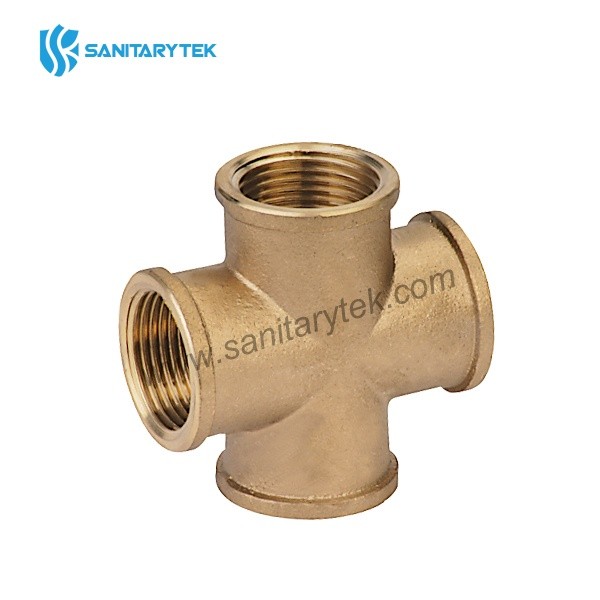 Brass equal cross female, brass threaded fitting that performs two equal branches of the same size as the main way. The brass equal cross is a brass pipe fitting that allows you to combine or split a fluid flow. It is a cross-shaped four-way accessory, one inlet and three outlet or two branches and a principal way. It has four mouths of equal dimension, all with female threads and flange reinforcement at the ends.