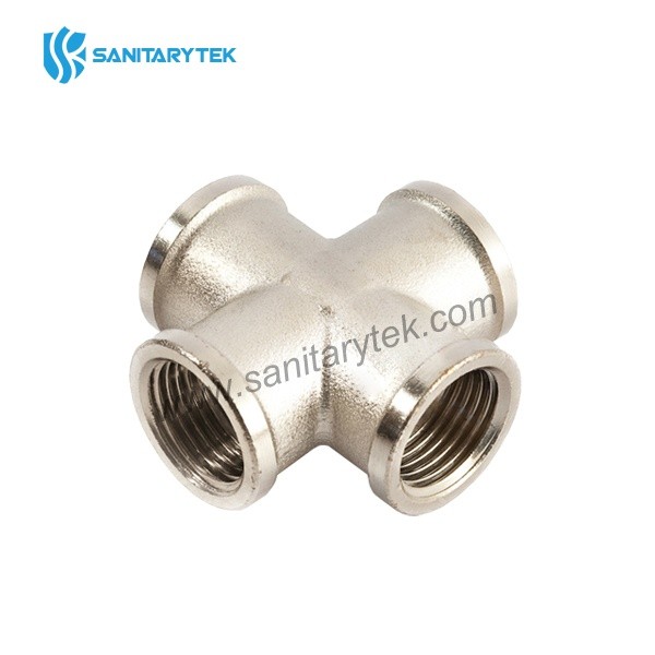 Brass equal cross female, brass threaded fitting that performs two equal branches of the same size as the main way. The brass equal cross is a brass pipe fitting that allows you to combine or split a fluid flow. It is a cross-shaped four-way accessory, one inlet and three outlet or two branches and a principal way. It has four mouths of equal dimension, all with female threads and flange reinforcement at the ends.