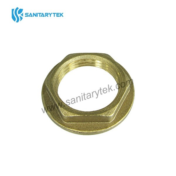 Brass flanged back nut used for fixing at locknut of brass fittings, taps or valves. The brass flanged blacknut is an accessory made of brass that usually goes with the tank connector. It is composed by a nut with hexagonal flange to help the tightening.