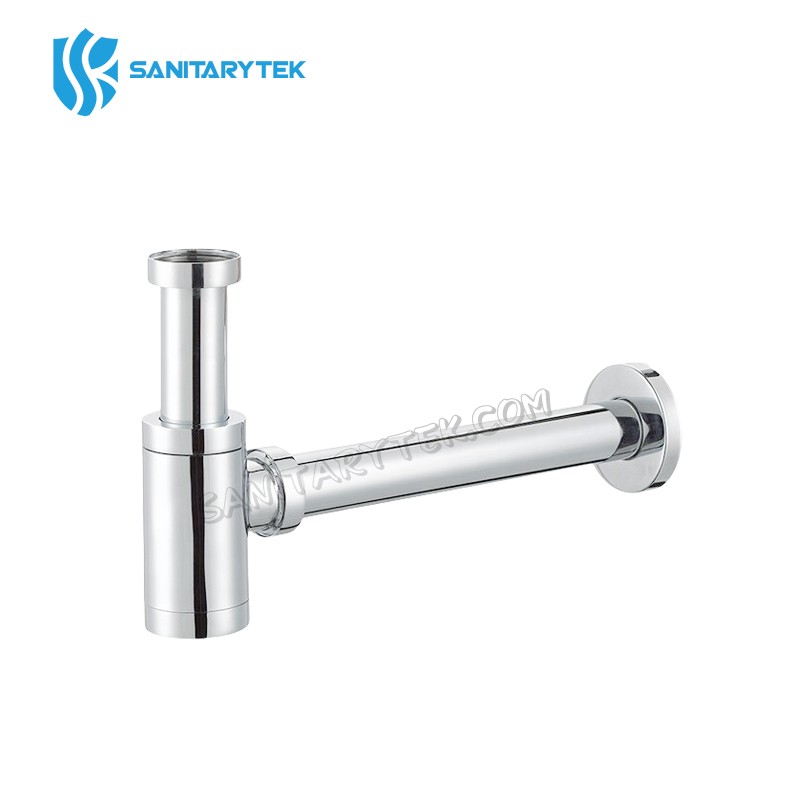 This chrome modern bottle trap for wash basin is provided with a chrome metal wall outlet and rosette.