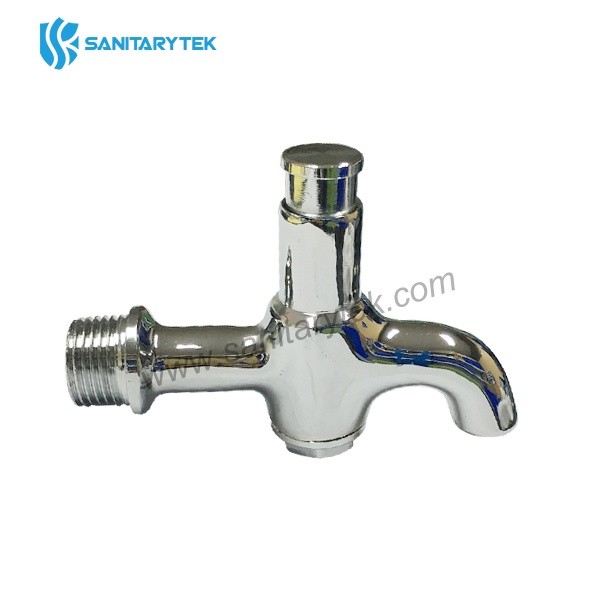 • Chrome-plated bib tap 1/2"M connection with push button: water dispensing occurs as long as the button is held down